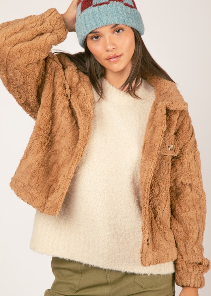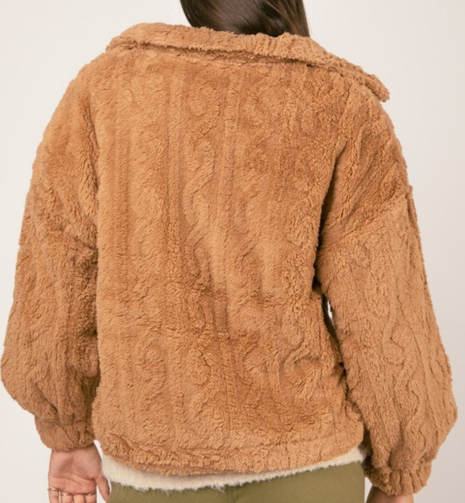 Tan cable pattern soft fleece fur drop shoulder oversized jacket 100%Polyester