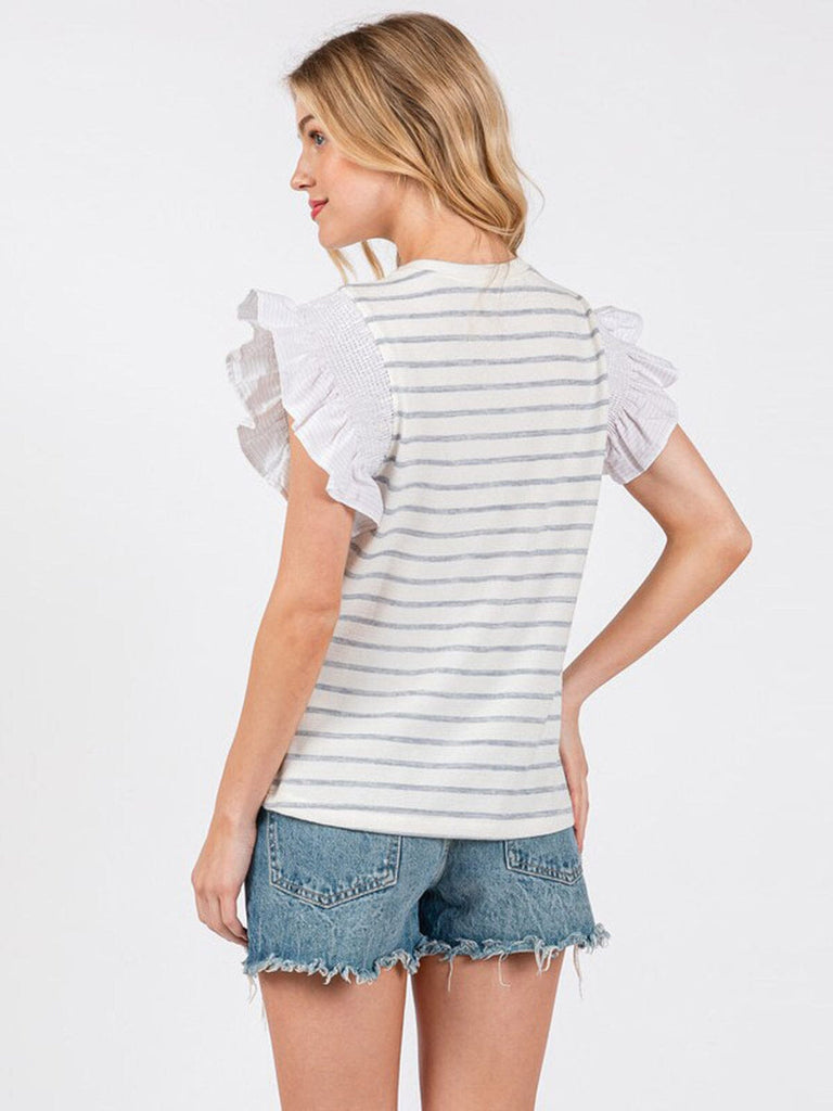 WOMEN'S SHORT RUFFLE SLEEVE STRIPES COLORBLOCK TOP 54% Rayon 40% Polyester 6% Spandex.* Model is wearing size S Length: 22" Bust: 36" Waist: 17"