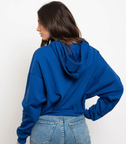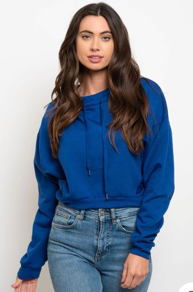 Electric blue oversized crop top long sleeve hooded sweater.