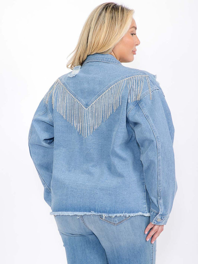 PLUS SIZE LONG SLEEVE BUTTON CLOSURE BACK FRINGE STUDS DISTRESS DENIM JACKET