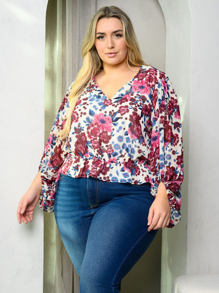 PLUS SIZE LONG SLEEVE V-NECK FLORAL TOP