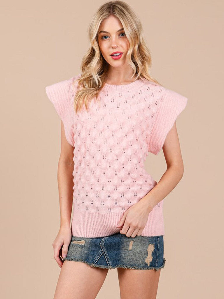 WOMEN'S SHORT SLEEVE WAFFLE DETAILED KNIT BLOUSE TOP