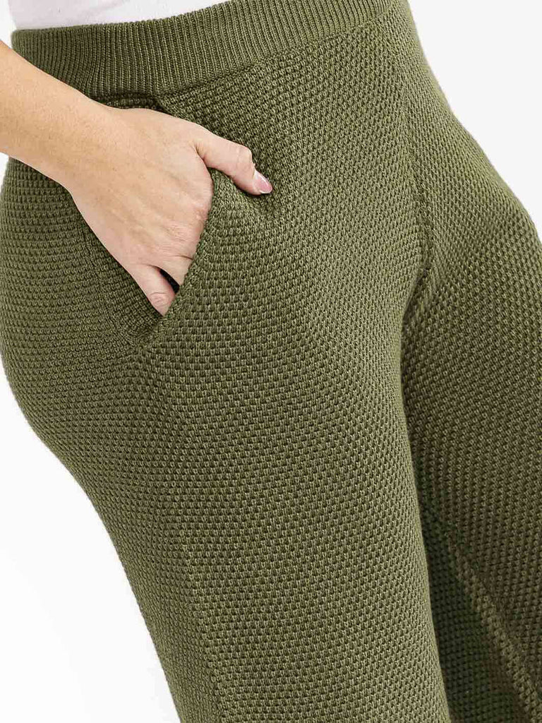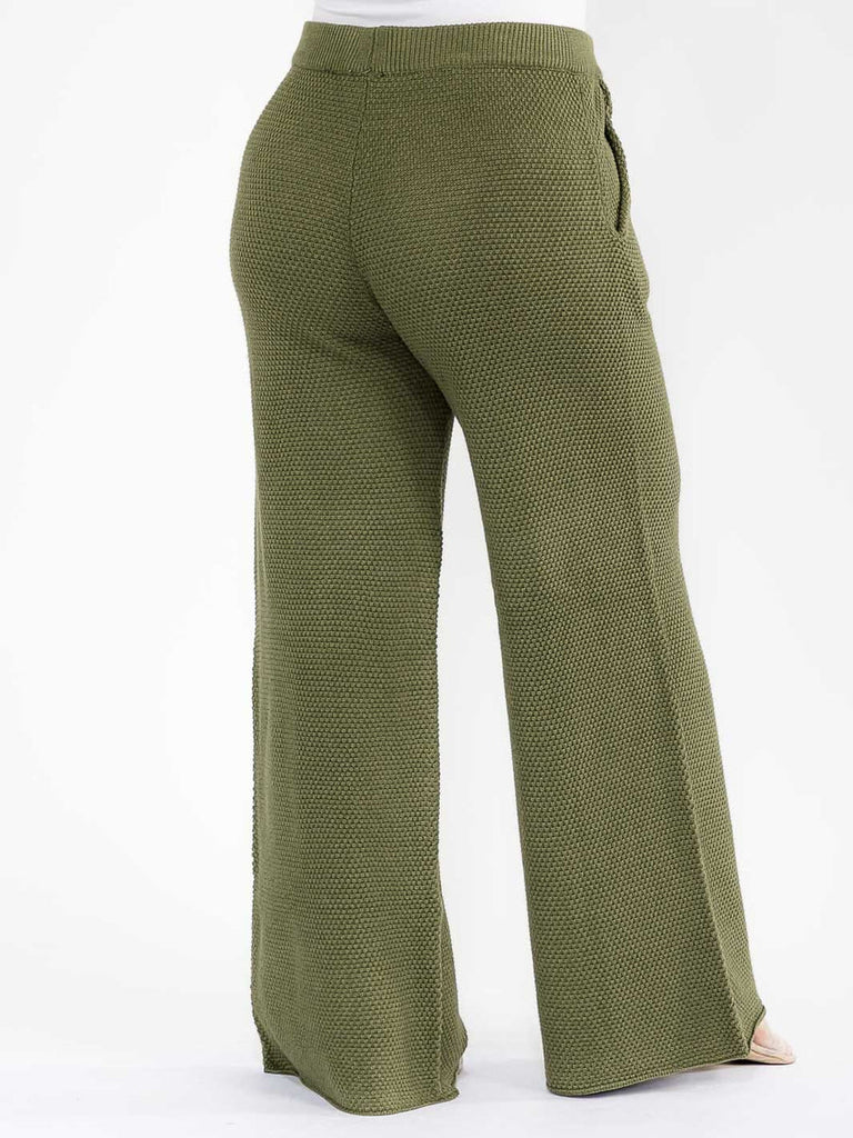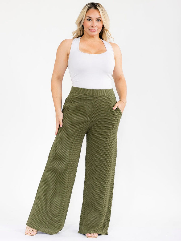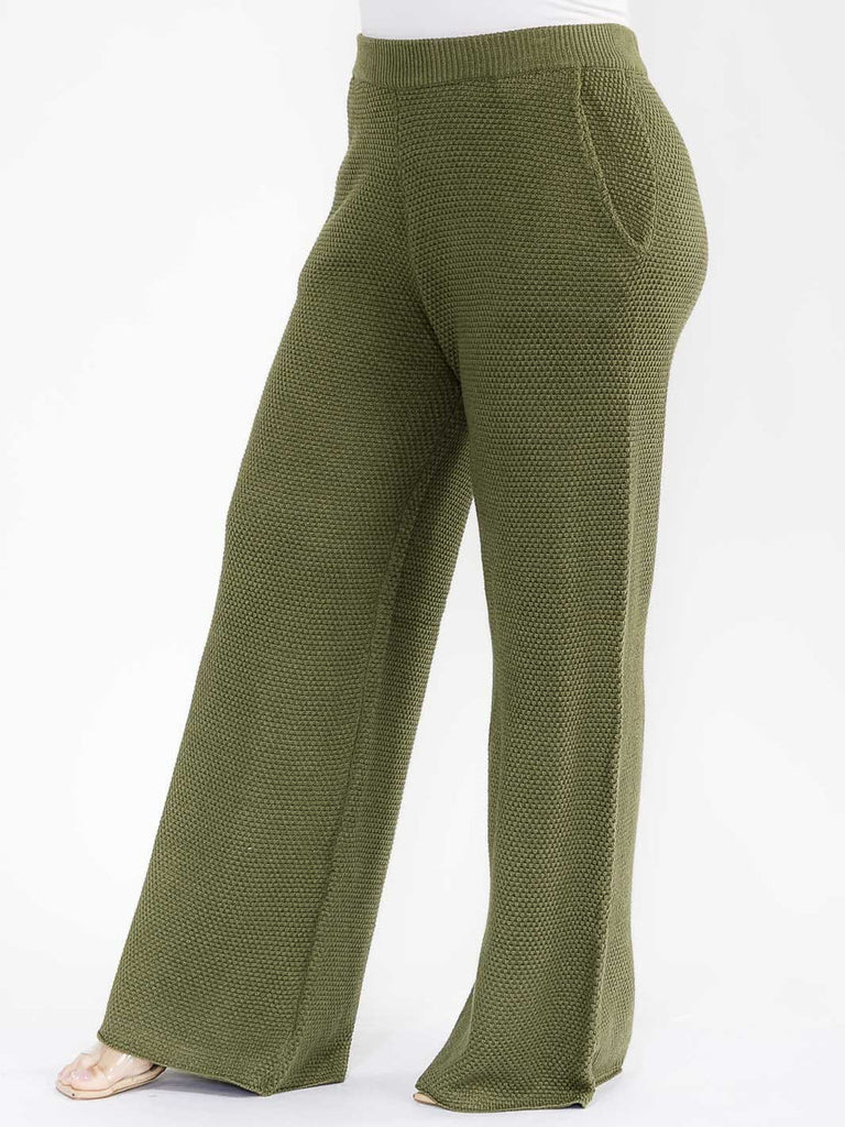 Soft acrylic-cotton blend, wide-leg silhouette, elastic waistband, practical front pockets, versatile styling for any season, plus-size fit, boutique-friendly appeal.