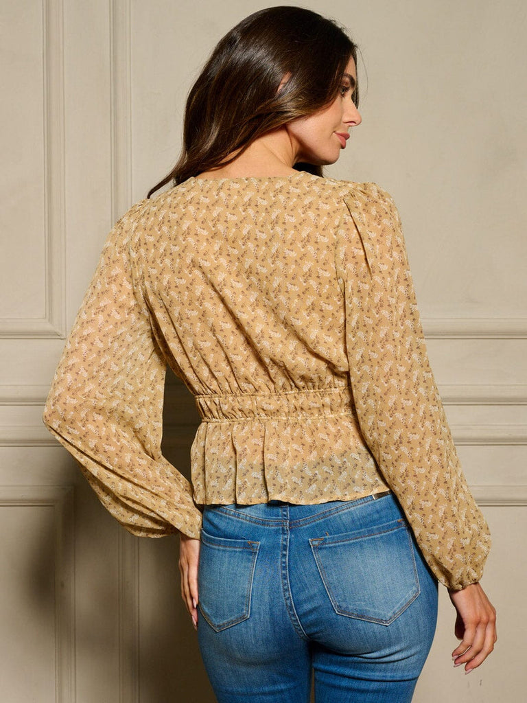 WOMEN'S LONG SLEEVE V-NECK PEPLUM FLORAL BLOUSE TOP100% Polyester Lining: 100% Polyester.Model is wearing size S Length: 19" Bust: 32" Waist: 14".