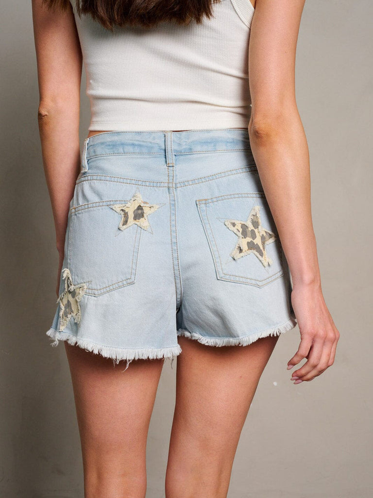WOMEN'S BUTTON CLOSURE POCKETS CAMO STARS DENIM MINI SHORTS100% Cotton.