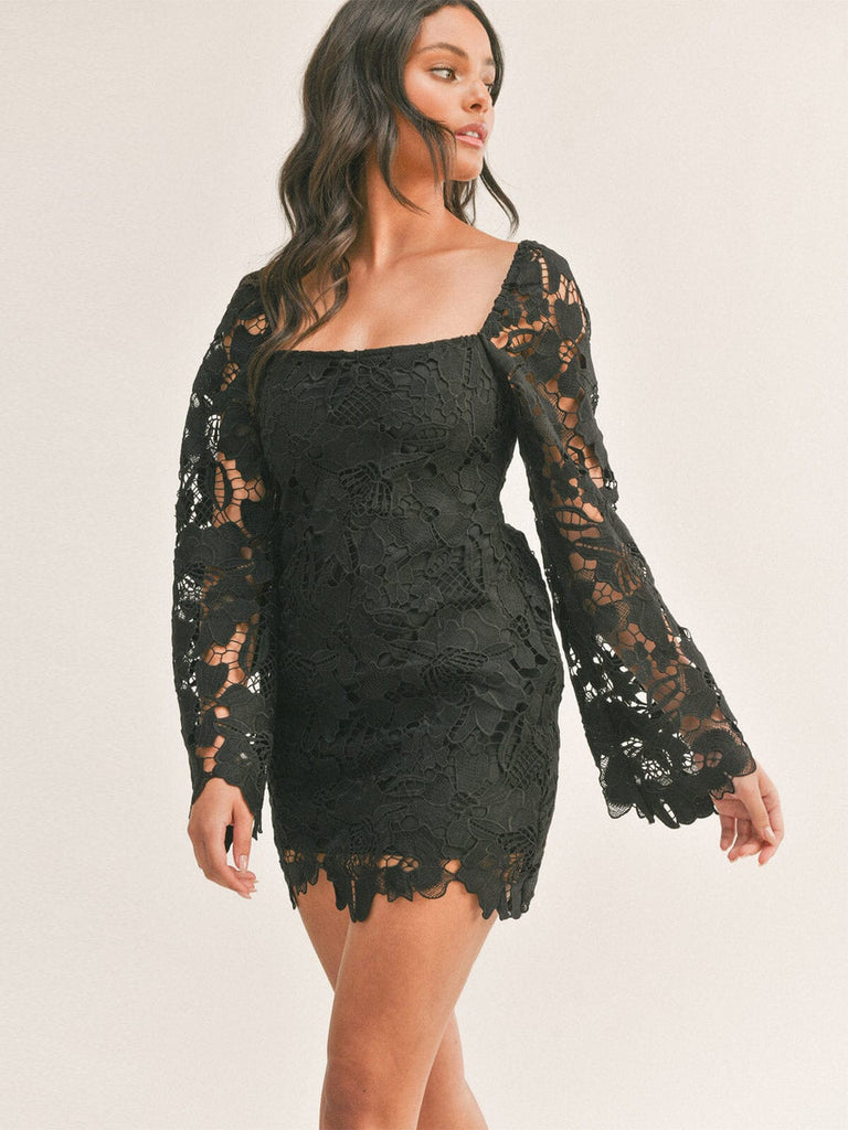 WOMEN'S LONG SLEEVE SQUARE NECK BODYCON CROCHET MINI DRESS100% Polyester Lining: 100% Cotton.