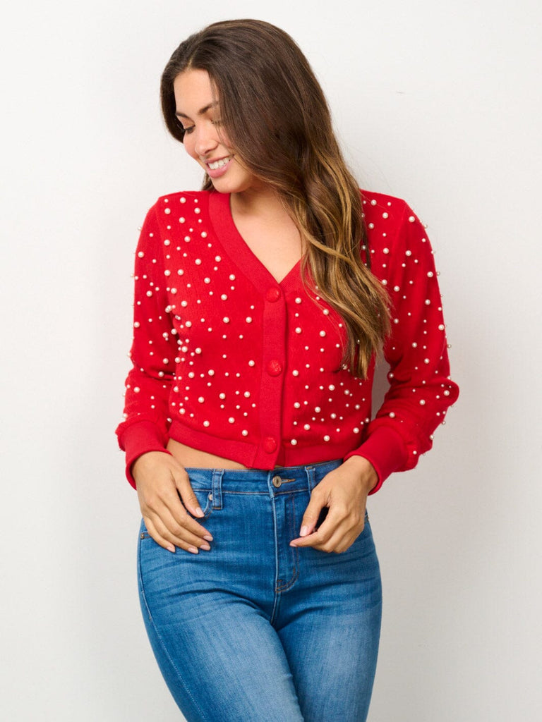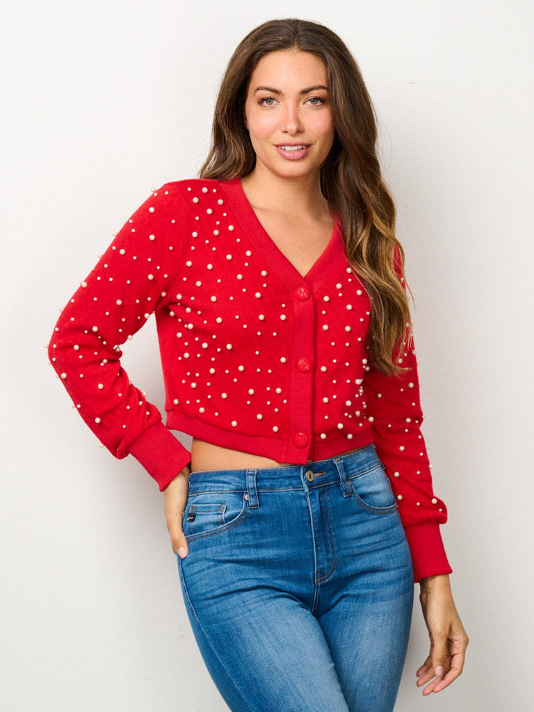 WOMEN'S LONG SLEEVE BUTTON UP PEARL DETAILED CROP TOP