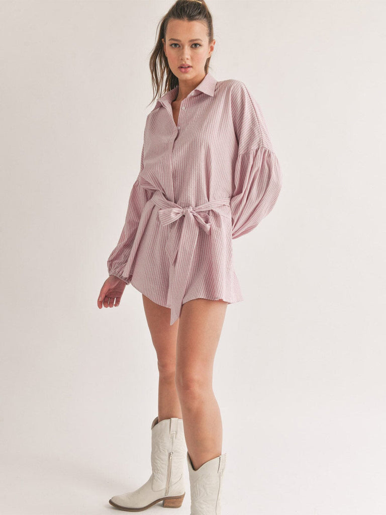 WOMEN'S LONG SLEEVE BUTTON UP SELF TIE STRIPES