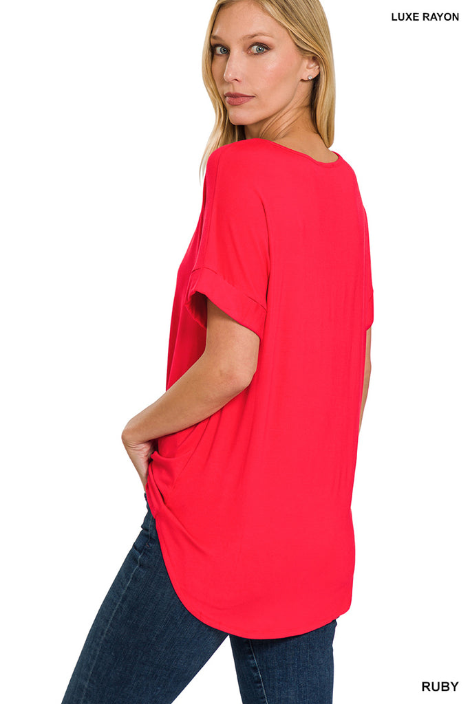 LUXE RAYON SHORT CUFF SLEEVE V-NECK ROUND HEM TOP